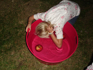 We had great fun picking apples at MacQueens Orchard about 2 weeks ago. It was a perfect Sunday afternoon. We must have gone picking earlier last year because all the tree bottoms were bare this time. But....Taylor loved climbing the BIG tree ladders to get the very best top apples and throw them down to daddy . We got Jonathans, Ida Reds and McIntosh. Dave and I were actually surprised she climbed that high. You can see in the photo...it is fairly high up there and she had no hesitation heading for the top. Emma & Ella did find a few straglers along the bottom to keep them busy.